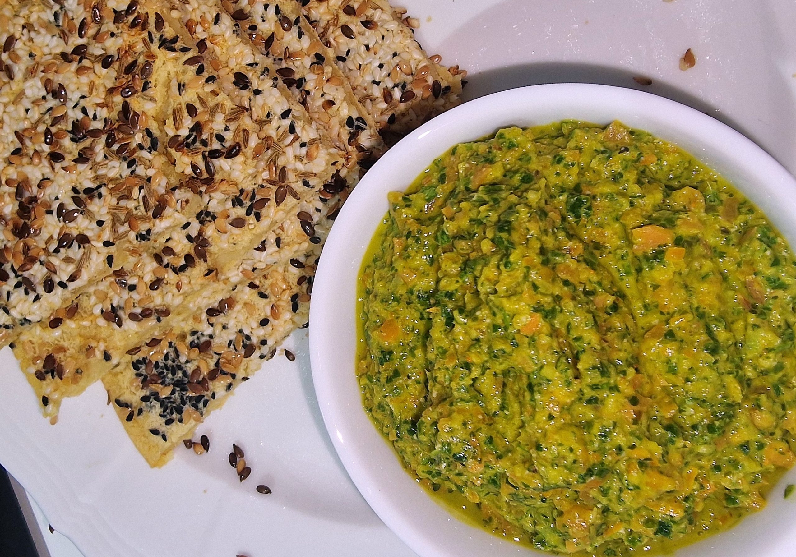 I introduced him to nutritional yeast, also known as “Nooch” — one of my favourite ingredients for making healthy food taste rich and satisfying. I made this dip using Nooch and flaxseed oil. To both our surprise, he loved it. One taste and he declared it “really tasty… like Parmesan cheese.” After trying the dip — somewhere between a green sauce and a vegetable pâté — he was instantly a fan and asked for the recipe.